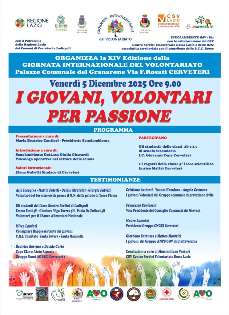 Anche quest’anno si celebra la Giornata internazionale del Volontariato con un convegno rivolto alle classi di scuola secondaria “I giovani volontari per passione”, organizzato Scuolambiente Roma nord in collaborazione con alcune realtà associative del territorio.