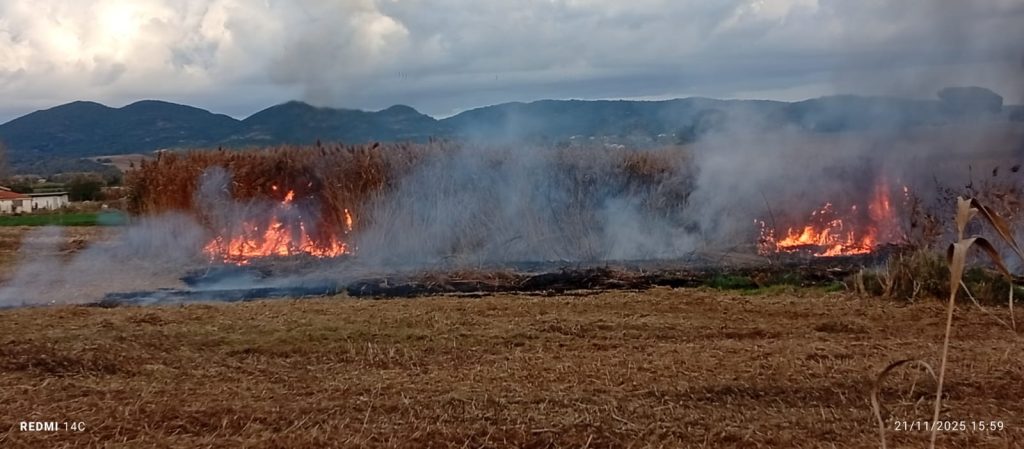 A fuoco sterpaglie e canneto sulla via Aurelia