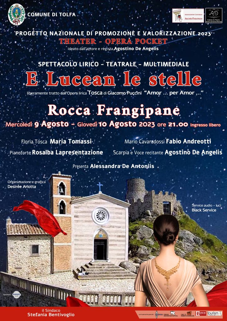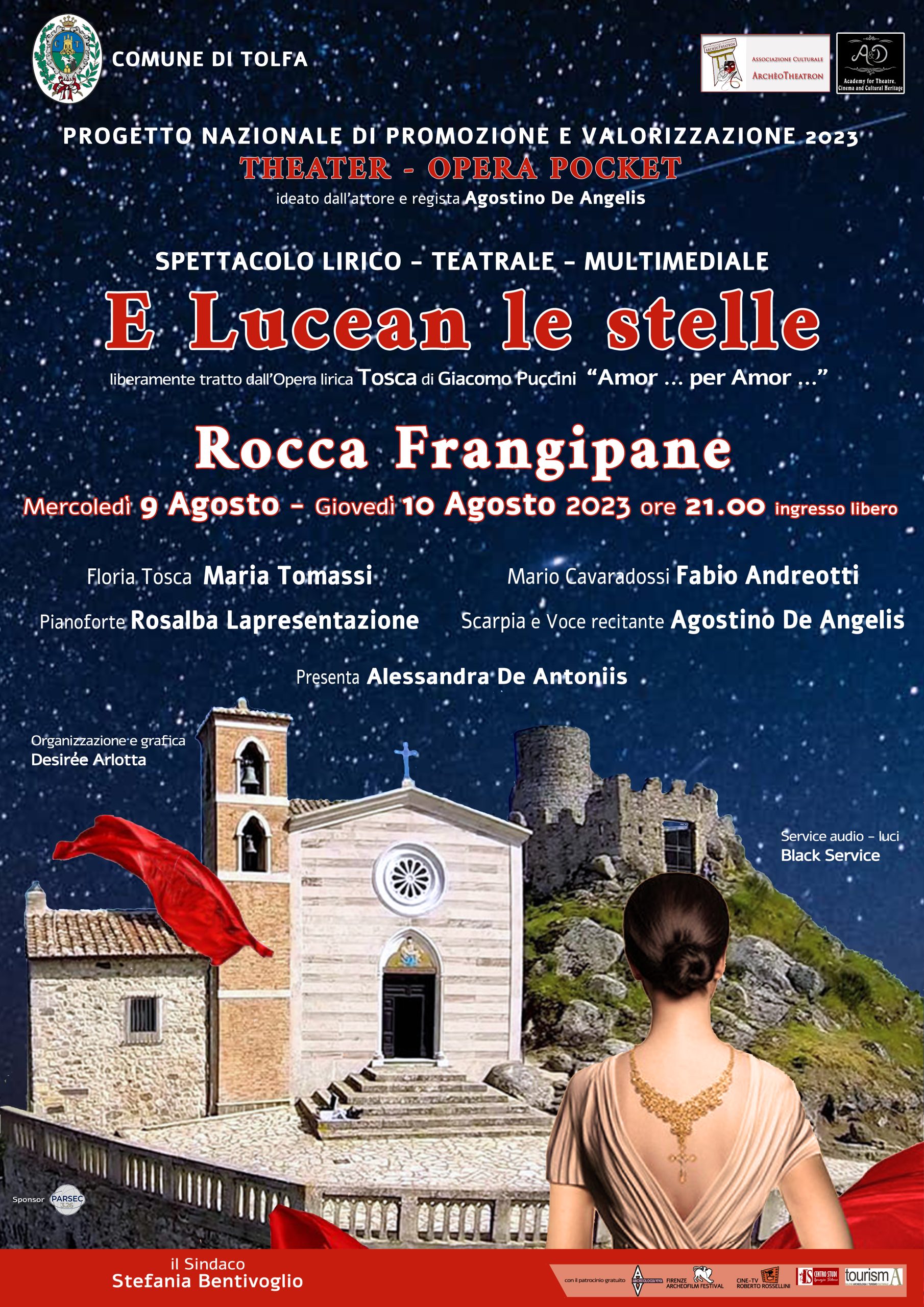 L’evento sarà lo Spettacolo Lirico-Teatrale-Multimediale “E Lucean le Stelle” liberamente tratto da Tosca di Giacomo Puccini, inserito nel Progetto Nazionale di Promozione e Valorizzazione 2023 “Theater-Opera Pocket” ideato dall’attore-regista Agostino De Angelis con il tenore Fabio Andreotti; curatrice del progetto Desirée Arlotta.