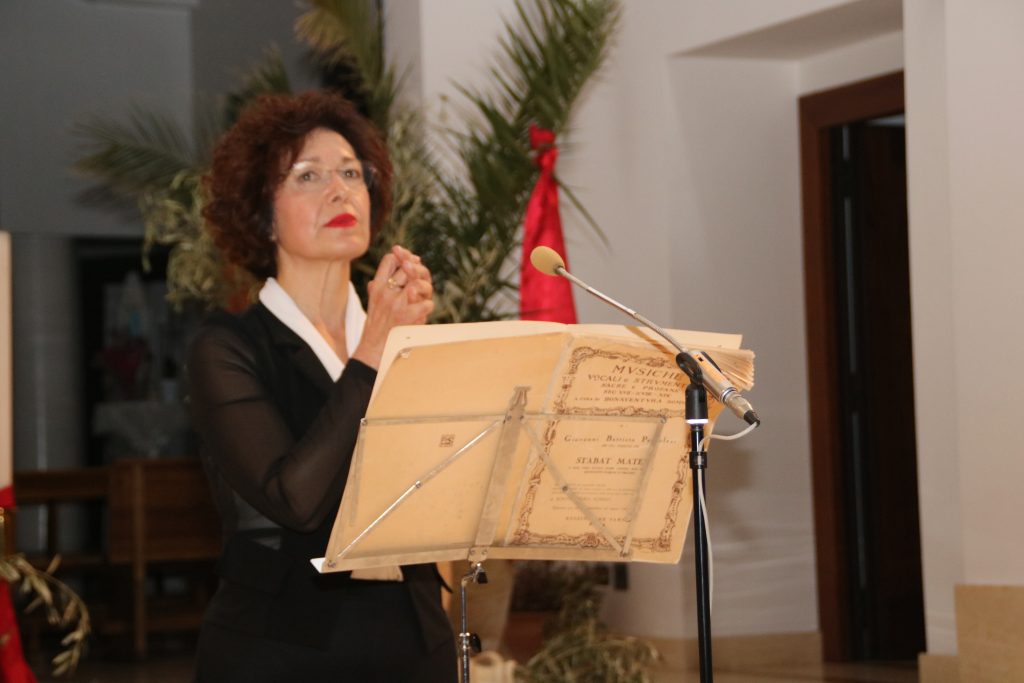 Ma credo che nessuno guardasse le bravissime soprano e contralto. Le orecchie erano rapite dalle loro voci, ma gli occhi erano fissi sull’emozionante filmato preparato da Desirèe Arlotta. Un filmato che è stato un pugno nello stomaco. Dove erano alternate immagini sacre di Madonne che assistevano piangenti, e impotenti, alla morte del loro figlio Gesù, alle drammatiche immagini provenienti dalla Palestina. Immagini di “Pietà” scolpite con le carni delle madri palestinesi con i loro figli morti in braccio. La passione di Cristo, sottolineata anche dall’opera di Pergolesi, accostata alla passione di un popolo senza pace e senza speranze. Brava Desirèe Arlotta.