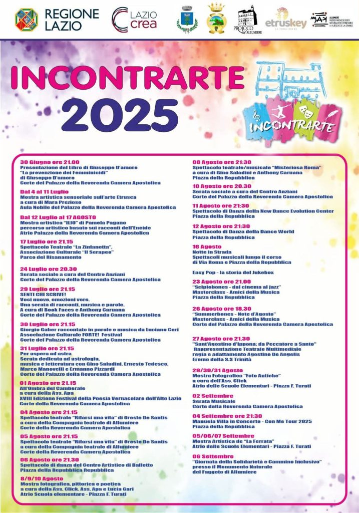 Ha preso il via lo scorso 30 giugno la nuova edizione di Incontrarte 2025, la rassegna culturale estiva promossa dal Comune di Allumiere con il sostegno della Regione Lazio e di Lazio Crea, in collaborazione con Pro Loco Allumiere, Etruskey, Sistema Museale, il Museo Archeologico Naturalistico e numerose associazioni del territorio.