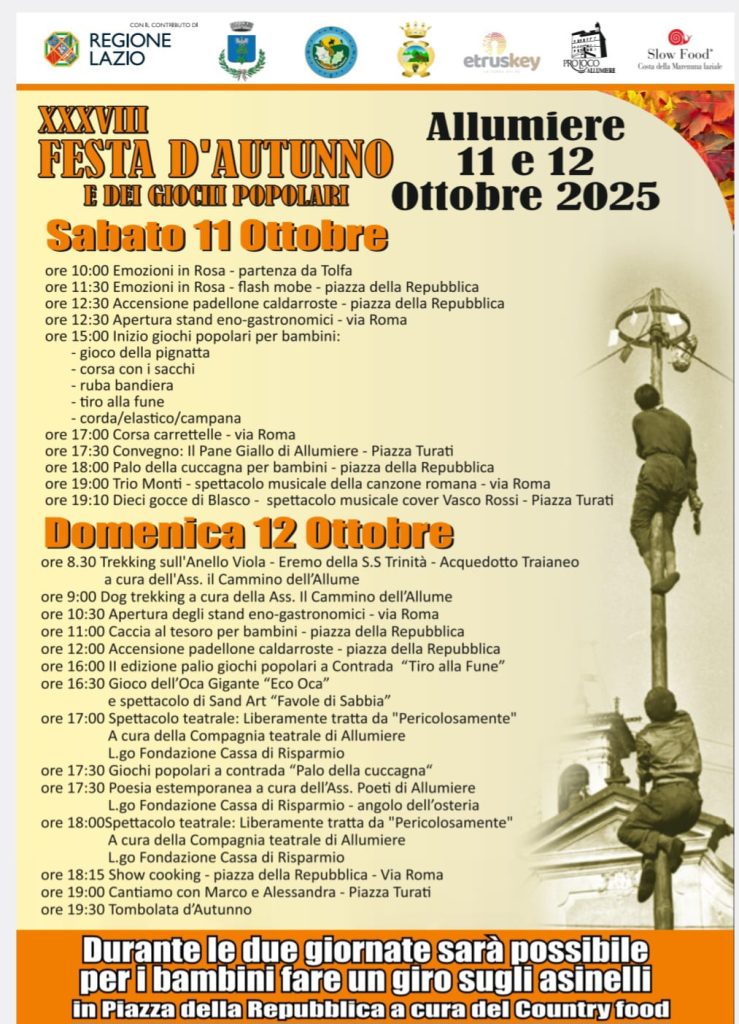 Allumiere si prepara a vivere un weekend all’insegna della tradizione con la 38ª edizione della Festa d’Autunno, uno degli appuntamenti più attesi e amati dalla comunità locale. L’evento, organizzato dalla Pro Loco di Allumiere con il patrocinio della Regione Lazio, si terrà sabato 11 e domenica 12 ottobre tra Piazza della Repubblica e via Roma, cuore pulsante del borgo, trasformandosi in un vivace palcoscenico di musica, spettacoli, gastronomia e giochi popolari.