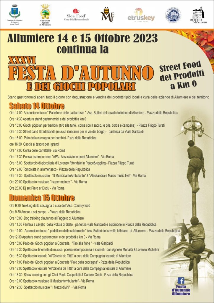 Il Comune di Allumiere ha reso noto il programma della Festa d’Autunno che continua questo weekend. Sabato 14 e domenica 15 ottobre proseguono gli appuntamenti con i giochi tipi della tradizione e con spettacoli di vario genere. Entrambe le giornate saranno ricche di appuntamenti: il sabato si partirà dalle 14, mentre la domenica le danze verranno aperte alle 9:30.