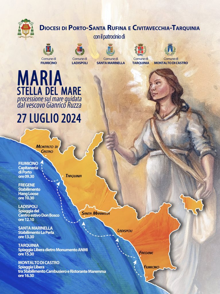La Diocesi di Porto Santa Rufina e Civitavecchia fa sapere che, in occasione dell’Anno Mariano le diocesi di Porto-Santa Rufina e di Civitavecchia-Tarquinia organizzano una processione a mare il prossimo sabato 27 luglio guidata dal vescovo Gianrico Ruzza. Il corteo partirà da Fiumicino (dalla Capitaneria di Porto alle 9.30) e risalirà la costa fino a Montalto di Castro dove arriverà alle 16.30 nella spiaggia libera, tra lo Stabilimento Cambusiero e il Ristorante maremma.