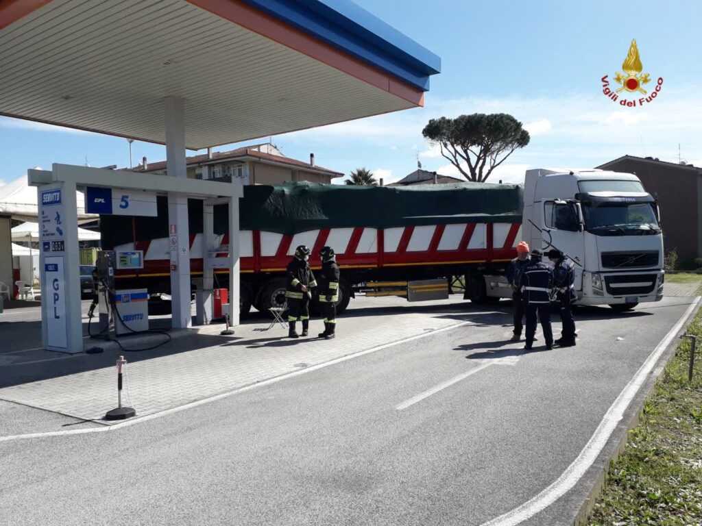 I vigili del fuoco hanno provveduto a mettere in sicurezza l’area interessata, verificando che non vi fossero danni all’impianto e perdite di gas dovute all’urto, prima di poter rimuovere il camion.