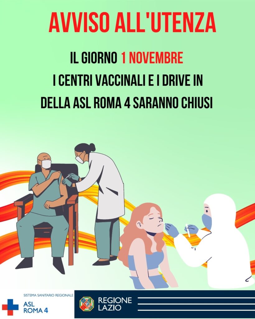 Avviso all’utenza: Domani 1 novembre i centri vaccinali e i drive in della Asl Roma 4 saranno chiusi.