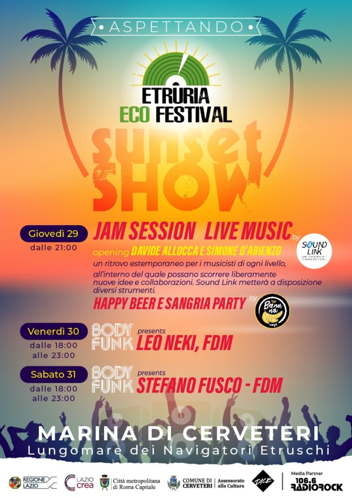 Aspettando Etruria Eco Festival anticipa al giovedì. Da questa sera, giovedì 29 luglio, sul nuovo Lungomare dei Navigatori Etruschi a Campo di Mare, tre serate speciali di musica, intrattenimento, DjSet e stand di artigianato a pochi passi dalla spiaggia.