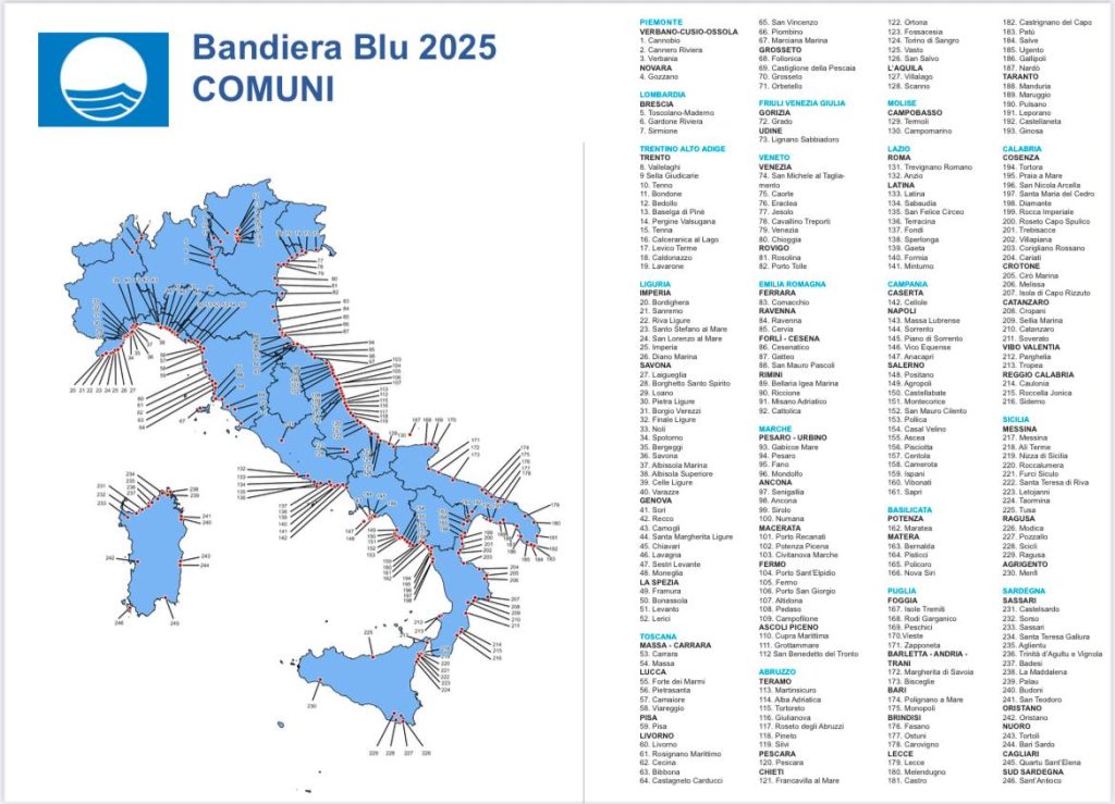 Le Bandiere Blu, simbolo di eccellenza ambientale e qualità delle acque, continuano a crescere in Italia: quest’anno sono 246 i Comuni rivieraschi e 84 gli approdi turistici riconosciuti, con circa l’11,5% delle spiagge premiate a livello mondiale. Rispetto al 2024, ci sono 15 nuove località che si aggiungono alla lista, mentre cinque comuni non confermano il riconoscimento.