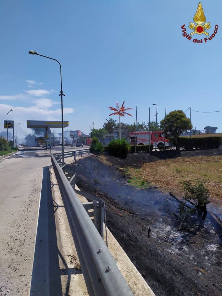 Le fiamme in poco tempo hanno raggiunto anche le sterpaglie laterali causando fumo e poca visibilità.
