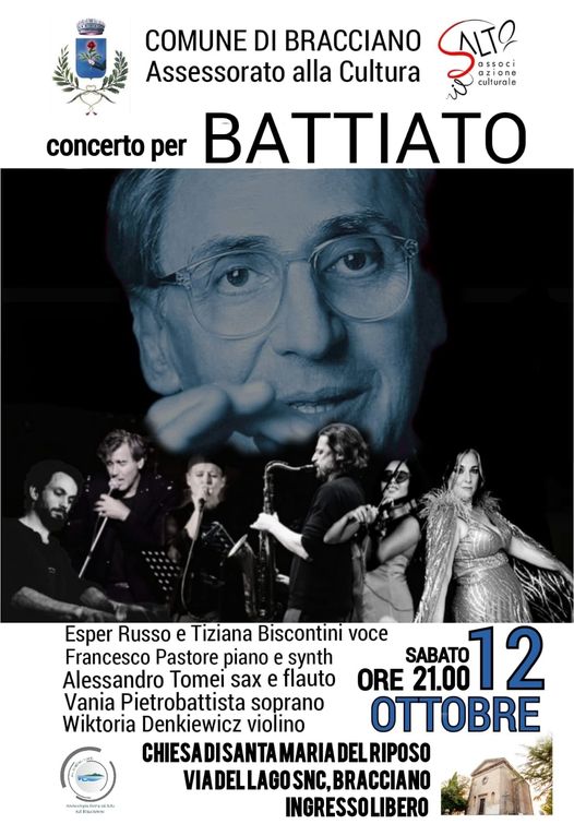 Sabato 12 ottobre, alle ore 21:00, presso la chiesa di Santa Maria del Riposo a Bracciano, si terrà un concerto tributo dedicato a Franco Battiato. Tanti talentuosi artisti, tra cui Esper Russo, Tiziana Biscontini, Francesco Pastore, Alessandro Tomei, Wiktoria Denkiewicz e Vania Pietrobattista, interpreteranno i brani più celebri di Battiato. L’evento sarà ad ingresso libero.