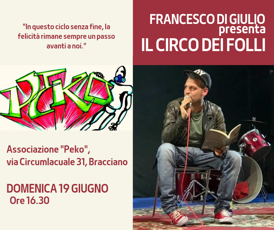Domenica 19 giugno 2022 alle ore 16.30 presso l’associazione “Peko” di via Circumlacuale 31a Bracciano, secondo appuntamento con l’autore Francesco Di Giulio che presenterà il suo nuovo libro dal titolo “Il circo dei folli”.
