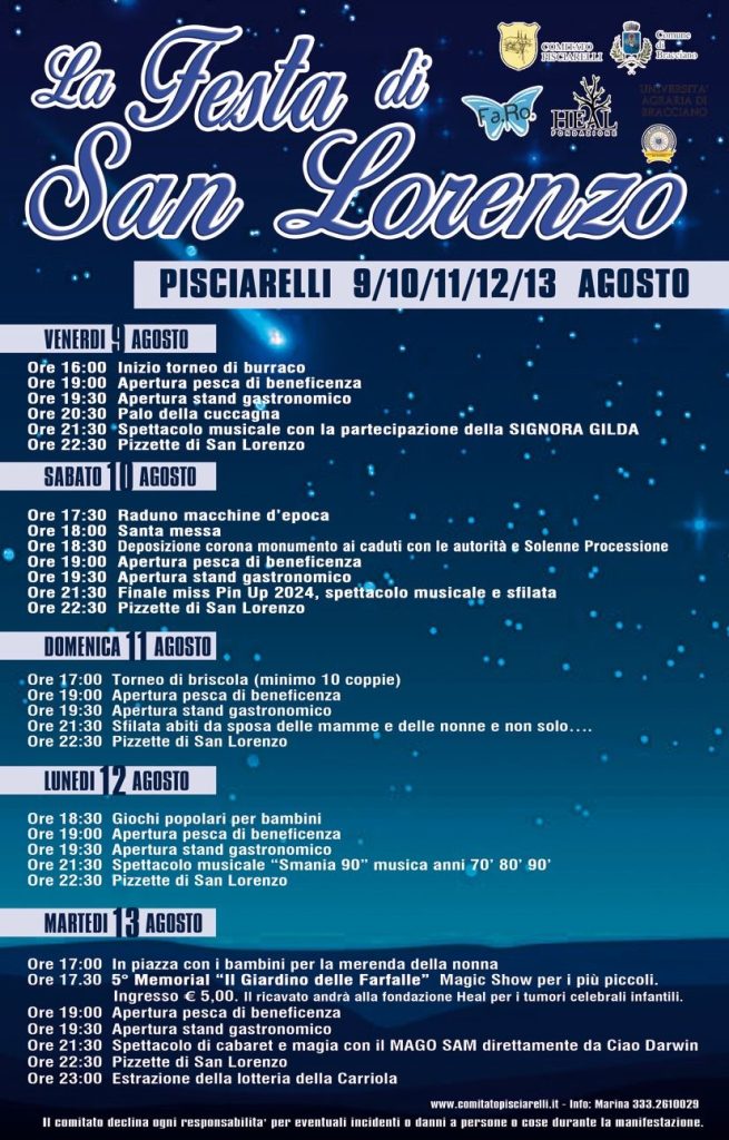 Riceviamo e pubblichiamo , il programma del Comune di Bracciano in occasione della Festa di San Lorenzo che si terrà nella frazione di Pisciarelli dal 9 al 13 agosto 2024.