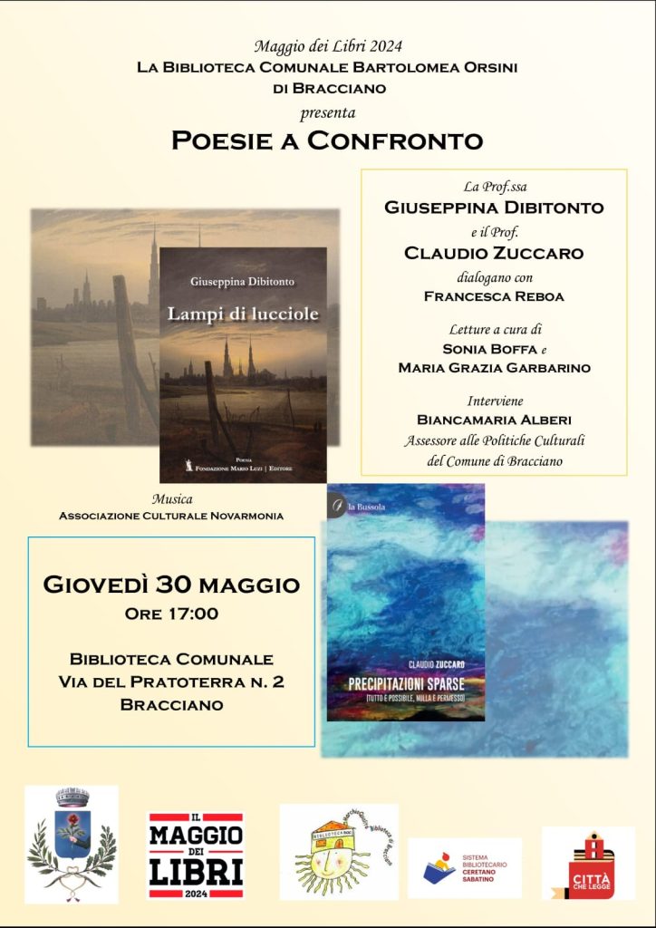 Maggio dei Libri a Bracciano, questa settimana la proposta è con la prof.ssa Giuseppina Dibitonto con il libro “Lampi di Lucciole” e il prof. Claudio Zuccaro con il libro “Precipitazioni sparse” dialogheranno con Francesca Reboa e ci presenteranno le nuove poesie.