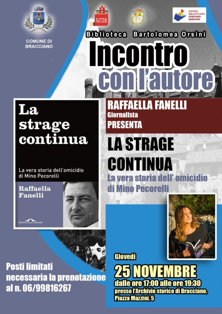 Si terrà presso la Biblioteca Bartolomea Orsini di Bracciano la presentazione dell’ultima opera di Raffaella Fanelli, edito da Ponte delle Grazie, il volume dal titolo “La strage continua”.