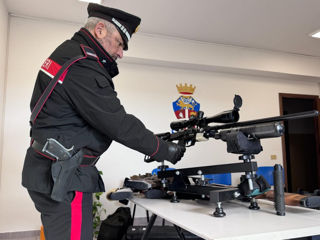 I militari quindi hanno svolto un complesso servizio di osservazione, perimetrando le abitazioni che per traiettoria potevano essere idonee ad esplodere i colpi e cinturando l’area. Nella giornata del 2 febbraio, quindi, mentre l’attività di tiro al bersaglio era in corso, i Carabinieri hanno fatto accesso in una palazzina con diverse abitazioni, escludendo quelle già note e individuando quella da cui venivano esplosi i colpi. Nonostante l’iniziale riluttanza, a seguito di numerosi inviti ad aprire la porta, l’uomo che era in casa ha fatto accedere il personale Arma che ha iniziato le attività di perquisizione. Con sorpresa è stato, quindi, rinvenuto un vero e proprio arsenale con strumenti predisposti per il tiro di precisione e un tavolo, sistemato nella cucina, dal quale l’uomo è gravemente indiziato di aver sparato. Sei le armi sequestrate dai Carabinieri, di cui almeno 3, in attesa dei dovuti accertamenti balistici, hanno una potenza tra i 40 e i 50 joule (ben al di sopra del limite consentito dalla legge che è di 7,5 per la detenzione legale). Con le armi sono stati sequestrati altrettanti silenziatori, centinaia di pallini di diverso calibro, meccanismi per la ricarica automatica tramite bombole e compressori ed anche diverse e costose ottiche per il tiro di precisione a distanza.