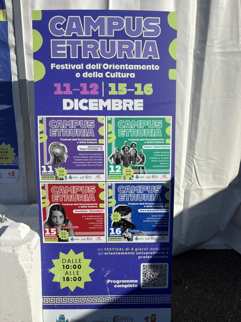 Si è svolto dall’11 al 16 dicembre Campus Etruria 2025, il festival promosso dall’Amministrazione comunale di Cerveteri per guidare i giovani nella scoperta delle proprie attitudini e delle opportunità professionali. L’evento ha messo a confronto il mondo della scuola con università, istituzioni culturali e professionisti dei settori più all’avanguardia.