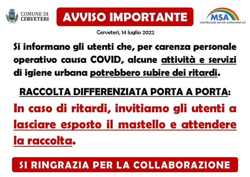 Si informano gli utenti che, per carenza personale operativo causa COVID, alcune attività e servizi di igiene urbana potrebbero subire dei ritardi.