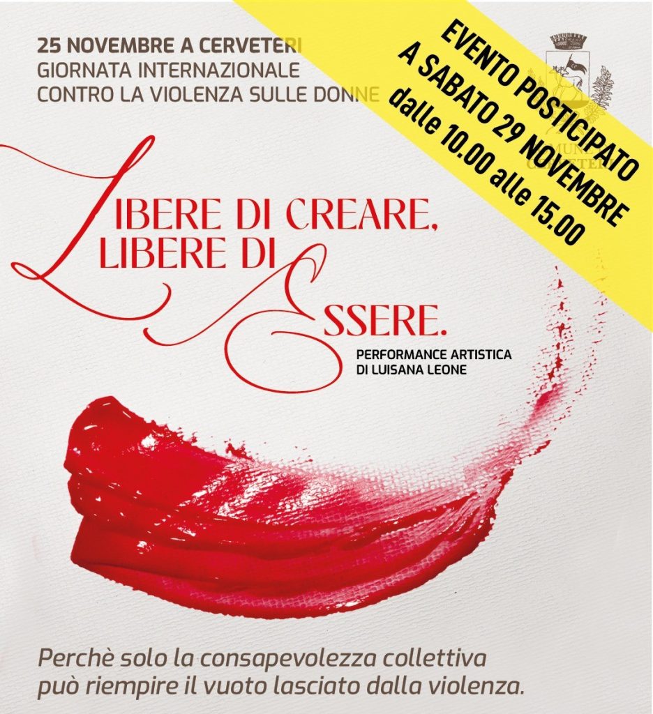 A causa delle condizioni meteo avverse di queste ore, la performance d’arte di Luisana Leone prevista per la giornata di domani, martedì 25 Novembre, Giornata Internazionale per l’eliminazione della Violenza contro le Donne e in programma a Cerveteri lungo la scalinata di Piazza Aldo Moro è stata rinviata a sabato 29 novembre, dalle ore 10:00 alle ore 15:00.