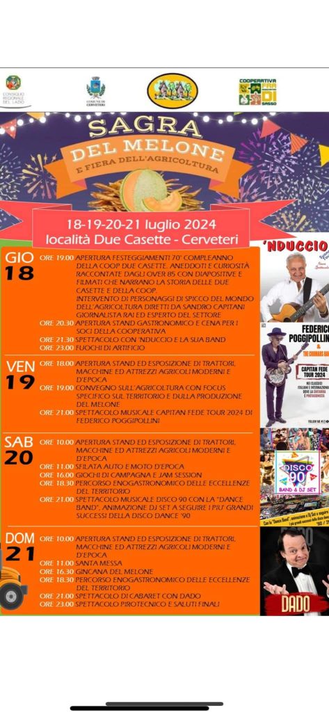 Dal 18 al 21 luglio in località due casette a Cerveteri partirà la sagra del Melone e la festa dell’agricoltura. Quattro giorni di eventi ed iniziative per raccontare la storia della Coop due casette, con aneddoti e curiosità raccontate dagli over 85 .