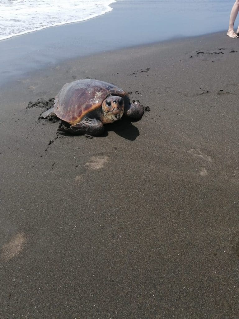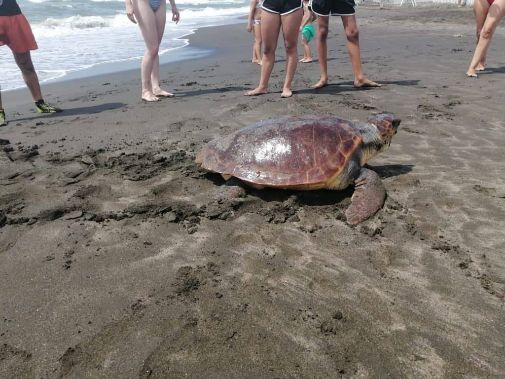 L’esemplare avvistato oggi, molto probabilmente a memoria di una vecchia rotta, ha raggiunto la costa di Cerveteri per compiere un atto vitale e delicato, quello del deposito delle uova in spiaggia. Ma la creatura, nel tentare di dare seguito a quello che viene considerato un miracolo della vita e della natura, nell’uscire dall’acqua e salire il bagnasciuga è rimasta però indispettita dalla presenza di molteplici bagnanti presenti alla riva ed avvicinatisi a lei perché incuriositi dalla sua presenza, tanto da indurla a riprendere immediatamente il mare.