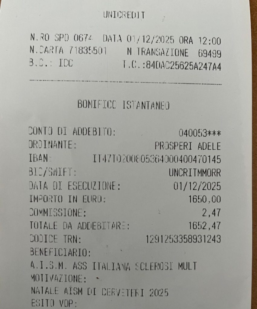 Nell’arco di tutto il 2025, grazie alla sensibilità e generosità della città, i Volontari di Aism a Cerveteri raccolti 3830euro per le attività dell’Associazione Italiana Sclerosi Multipla