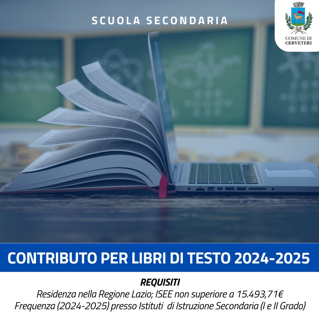 Il Comune di Cerveteri informa che è stato pubblicato un avviso per il contributo per la fornitura gratuita totale o parziale dei libri di testo, dizionari, libri di lettura scolastici, sussidi digitali e notebook per l’anno scolastico 2024/2025.