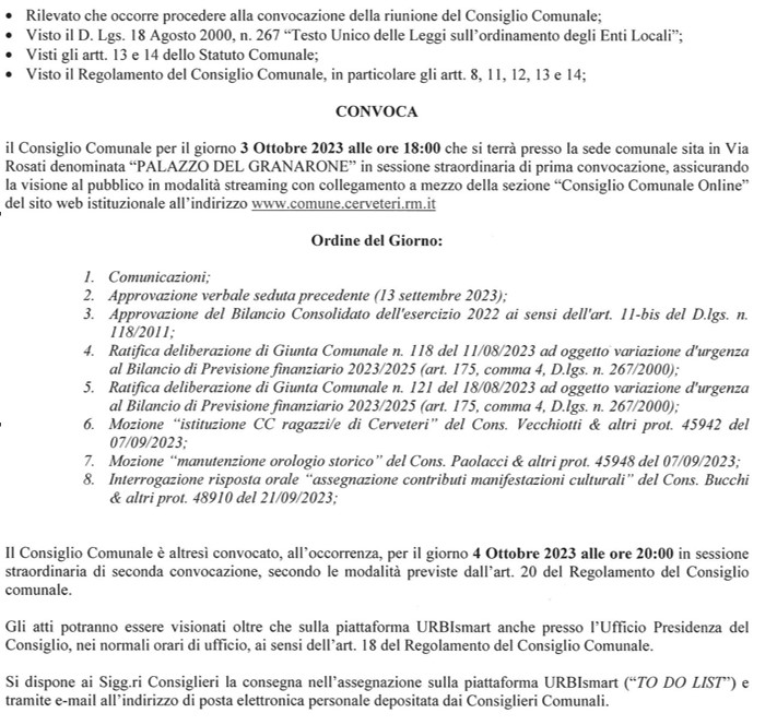 Il Presidente del Consiglio Carmelo Travaglia ha convocato la massima assise del Comune di Cerveteri per il 3 ottobre. L’appuntamento è alle ore 18:00 al Palazzo Del Granarone e sarà possibile seguire il Consiglio anche da remoto. Dopo le ultime sedute decisamente effervescenti, i politici cerveterani si riuniscono per discutere ben 8 punti all’ordine del giorno. Nel caso in cui non si riuscissero a completare tutte le operazioni previste, si proseguirebbe anche il giorno successivo.