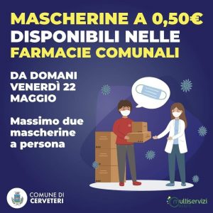 Da domani, venerdì 22 maggio le Farmacie Comunali di Cerveteri venderanno le mascherine protettive al costo calmierato di 0,50 centesimi di euro così come previsto dal Decreto del Commissario Domenico Arcuri.