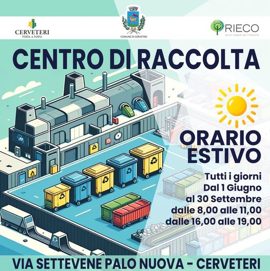 FacebookTweetLikeEmail Definito l’orario estivo del centro di raccolta di Cerveteri. Tutte le info nella sottostante tabella. Cerveteri, definito l’orario estivo del centro raccolta rifiutiFacebookTweetLikeEmail Share: