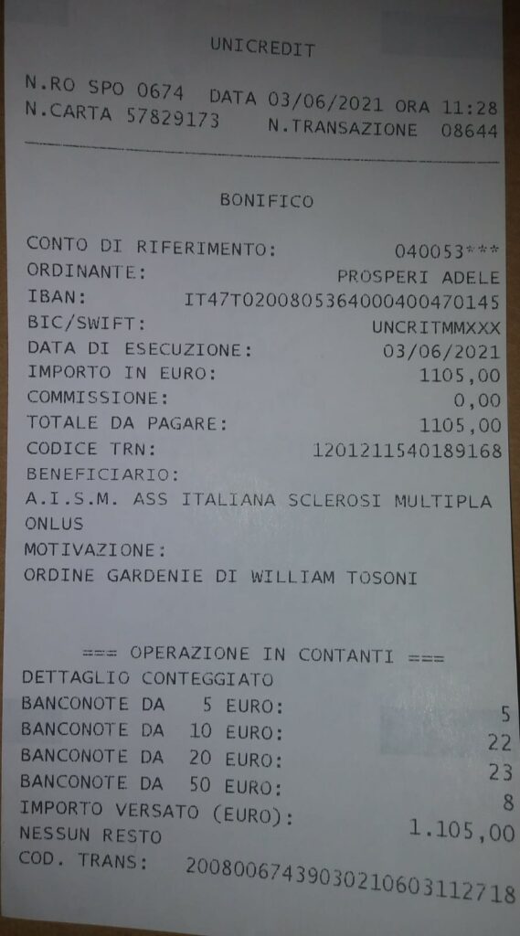“Grazie, dal profondo del cuore, il nostro più sincero e vivo ringraziamento a tutti coloro che hanno sostenuto AISM – Associazione Italiana Sclerosi Multipla e che con generosità e sensibilità hanno acquistato le nostre Gardenie”.
