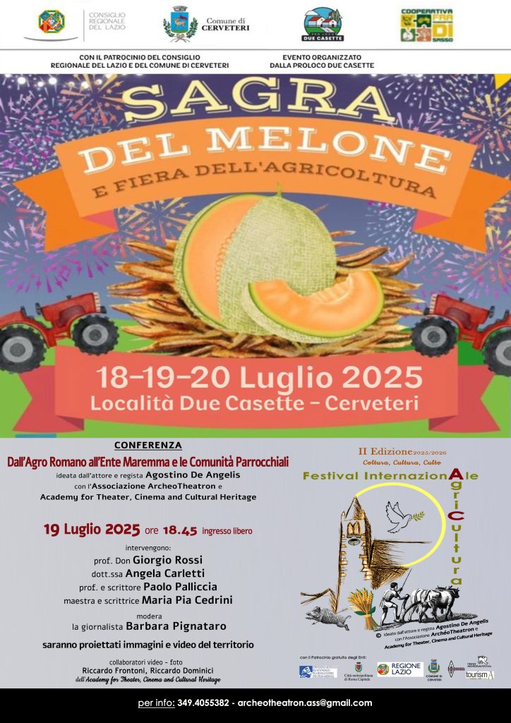 Sabato 19 Luglio alle ore 18.45, in occasione della Sagra del Melone che si terrà dal 18 al 20 luglio nella località Due Casette a Cerveteri, organizzata dalla Pro Loco Due Casette, si terrà la conferenza dedicata alla storia del territorio agricolo, dall’Agro Romano alla riforma Agraria dell’Ente Maremma e all’importanza delle Comunità Parrocchiali, ideata dall’attore e regista Agostino De Angelis e l’Associazione Culturale ArcheoTheatron con il presidente Desirée Arlotta.