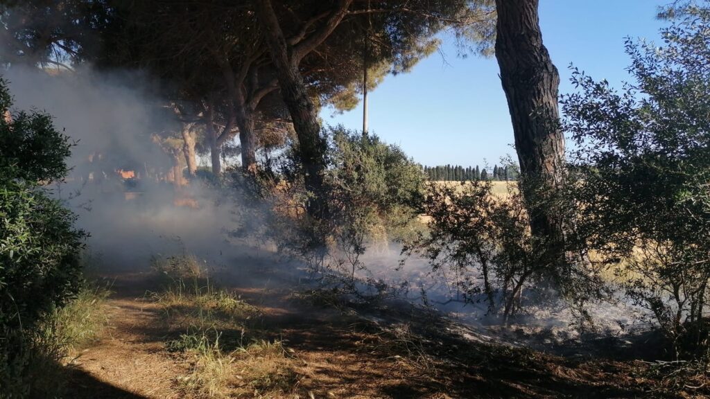 Cerveteri, incendio a via Zambra, il fuoco lambisce la pineta e i campi di gravo. Intervento della Protezione civile –
