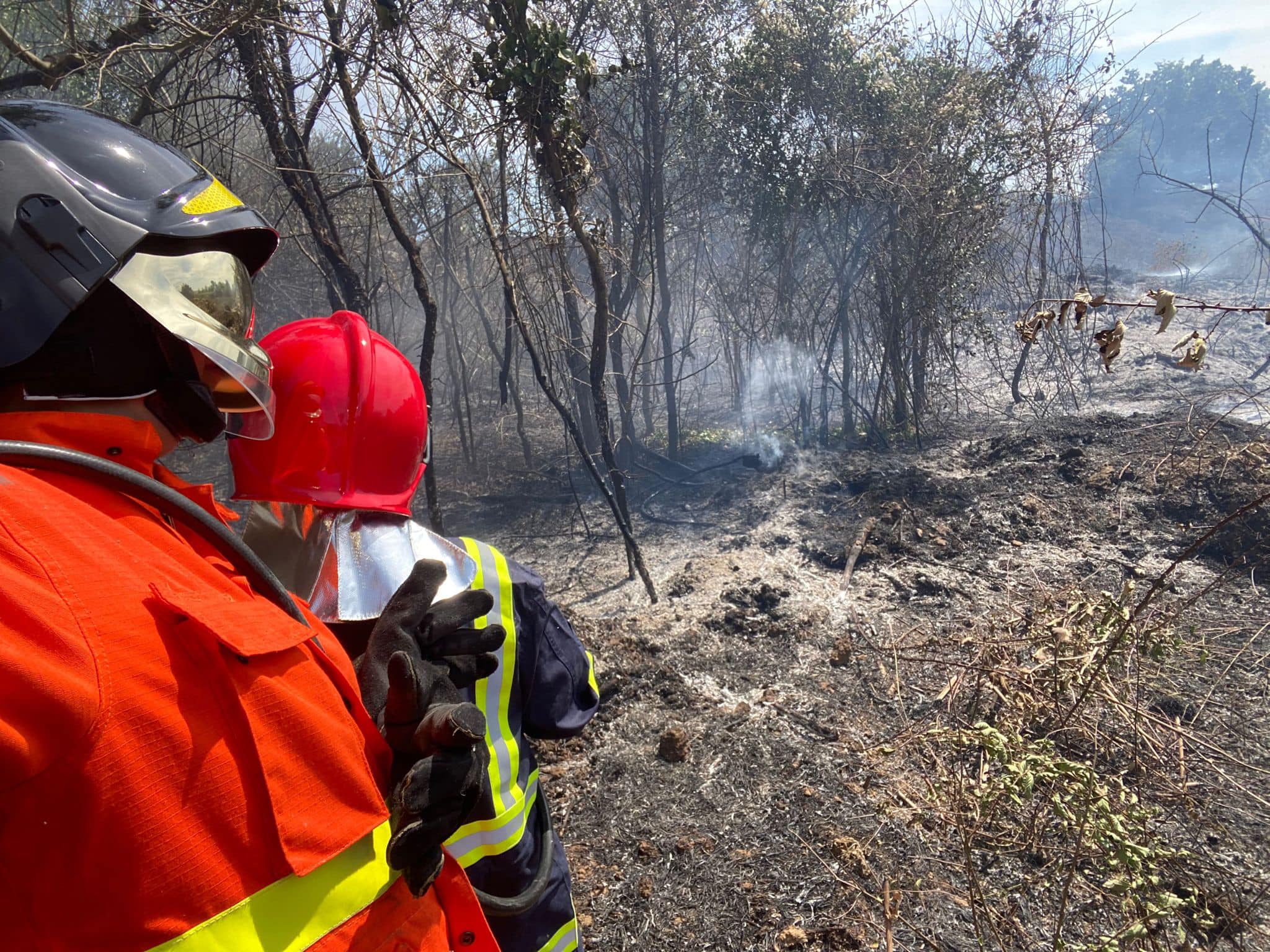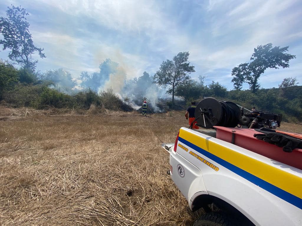 Una squadra Aib della Protezione Civile Avalon è impegnata in un intervento di spegnimento di vegetazione e sterpaglie.