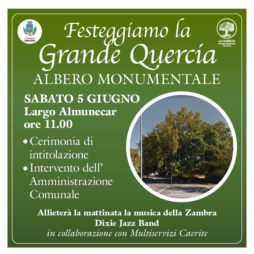Per celebrare questo prestigioso riconoscimento, l’Assessorato alle Politiche Ambientali del Comune di Cerveteri, in concomitanza della Giornata Mondiale dell’Ambiente, ha organizzato per sabato 5 giugno a partire dalle ore 11:00 una piccola cerimonia ai piedi proprio della Quercia di Largo Almuneacar, dove verrà svelata una targa e la Zambra Dixie Jazz Band, raffinato quintetto jazz itinerante, allieterà l’evento con un intrattenimento musicale.