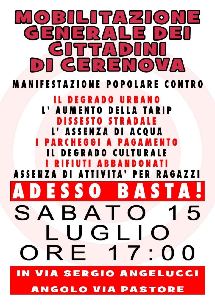 È stata indetta una mobilitazione spontanea e popolare dei cittadini di Cerenova per sabato 15 luglio alle ore 17:00 in via Sergio Angelucci, all’angolo con via Pastore.