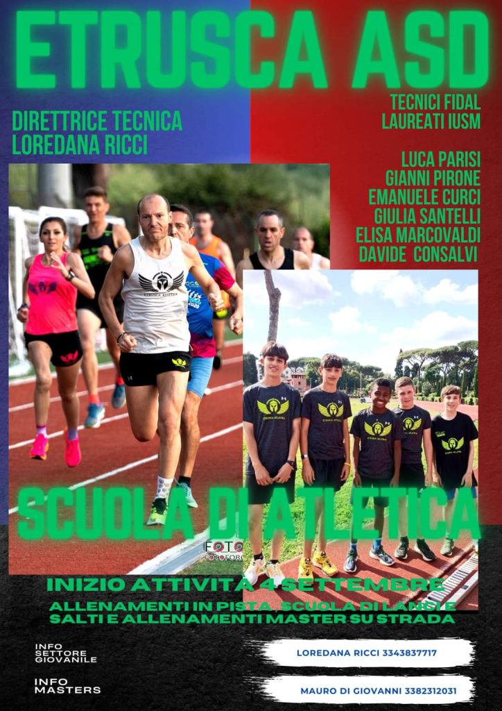 Dal 4 settembre riprenderanno le attività e gli allenamenti dell’Etrusca ASD, la scuola di atletica del territorio. Il team capitanato dalla direttrice tecnica Loredana Ricci e da tanti tecnici riconosciuti dalla federazione è pronto a lavorare sui talenti di Cerveteri e non solo.