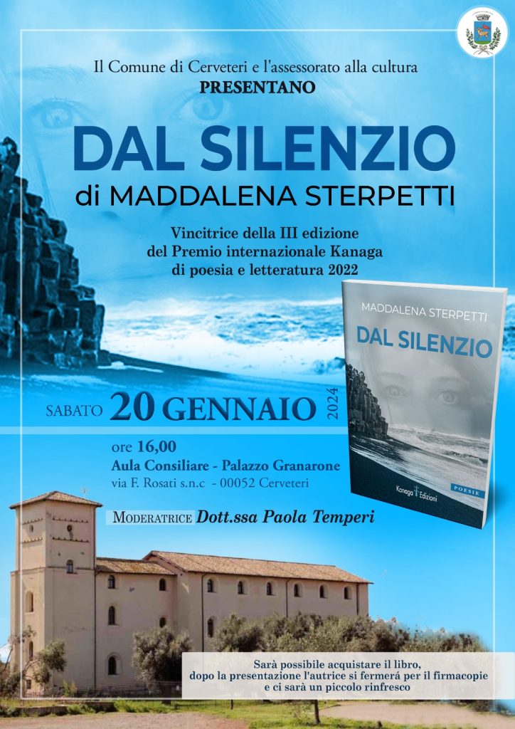 Il Comune di Cerveteri e l’assessorato alla cultura sono lieti di presentare “Dal Silenzio” di Maddalena Sterpetti, vincitrice della terza edizione del premio internazionale Kanaga di poesia e letteratura 2022. L’evento di presentazione si terrà sabato 20 gennaio alle ore 16.00 presso il Palazzo del Granarone a Cerveteri, nell’Aula Consiliare. La moderatrice dell’incontro sarà la Dottoressa Paola Temperi.