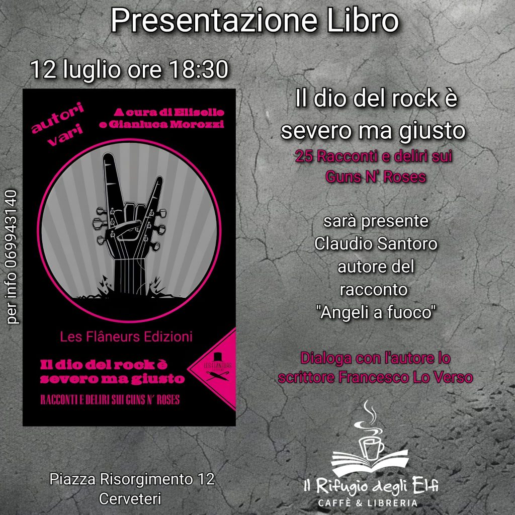 Venerdi 12 luglio 2024 alle ore 18:30 ci sarà la presentazione del libro “Il dio del rock è severo ma giusto – Racconti e deliri sui Guns N’ Roses – Sex, drugs and rock’n’roll” Les Flâneurs Edizioni. Sarà presente Claudio Santoro autore del racconto “Angeli a fuoco” che dialogherà con il giornalista Francesco Lo Verso.