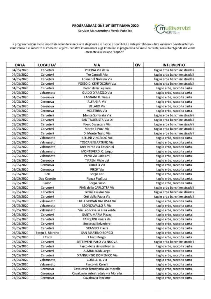 Cerveteri, pubblicato il calendario settimanale degli interventi