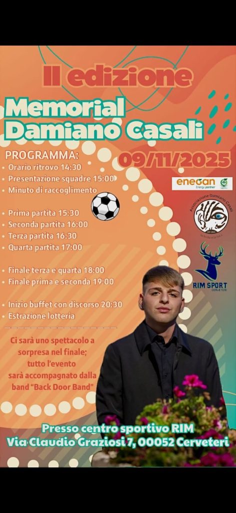 Si svolgerà domenica 9 novembre la seconda edizione del Memorial Damiano Casali organizzato dall’associazione a lui intitolata. A partire dalle ore 14:30, presso il centro sportivo Rim di Cerveteri (Via Claudio Graziosi) decine e decine di ragazzi scenderanno in campo per un torneo calcistico nel ricordo di Damiano.