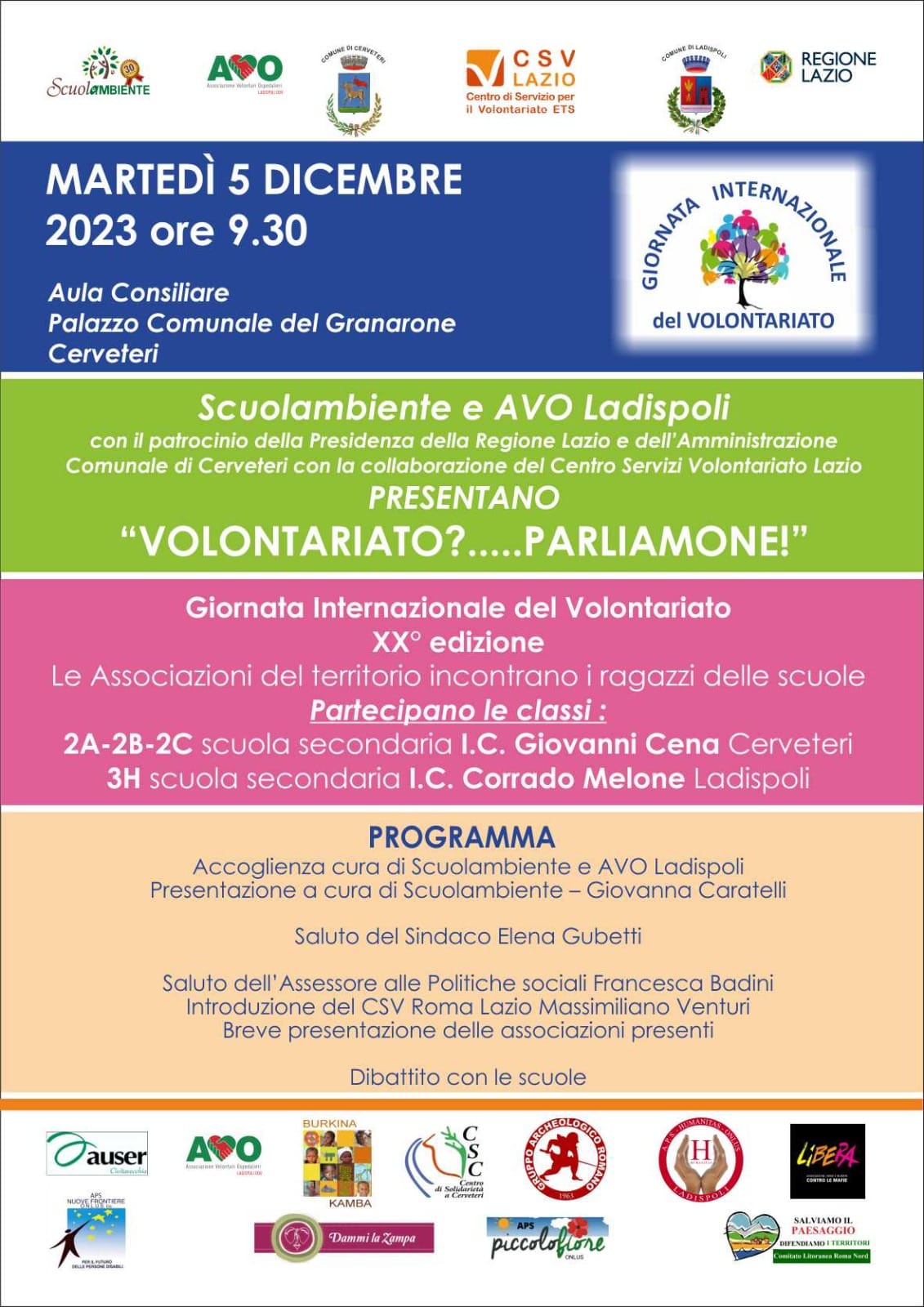 “Volontariato? Parliamone…”: questo è il titolo della Giornata mondiale del Volontariato organizzata da Scuolambiente in collaborazione con Avo Ladispoli Centro Servizi per il Volontariato presso la sede comunale del Granarone di Cerveteri.