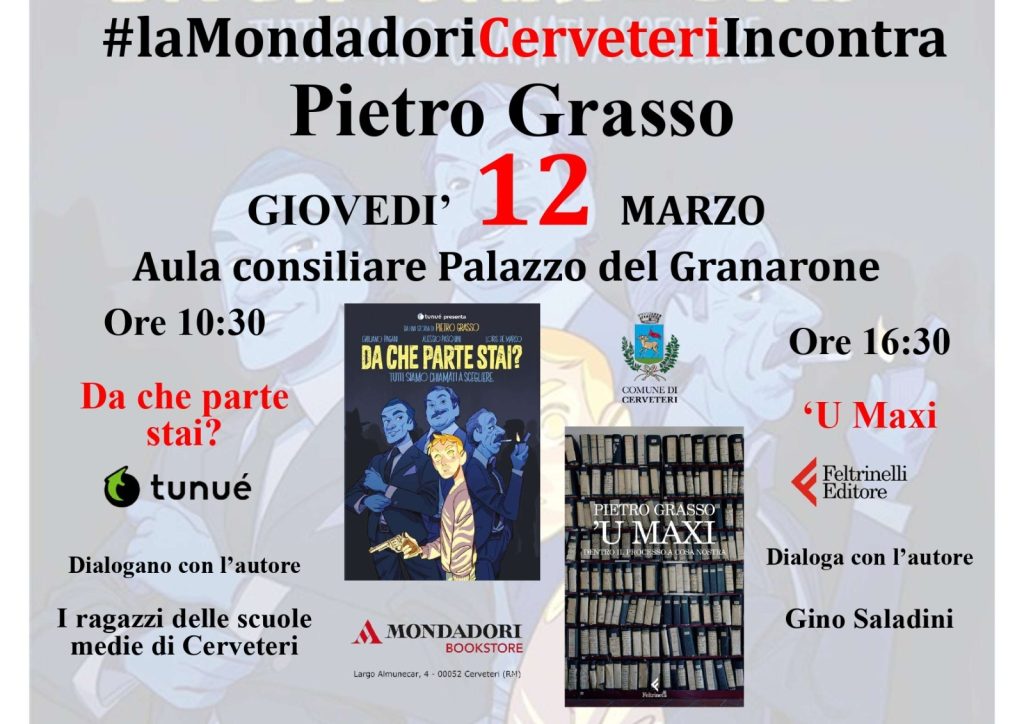 Giovedì 12 marzo invece, Mondadori insieme al Comune di Cerveteri propongono una giornata dedicata alla legalità, alla lotta alle mafie e soprattutto ai ragazzi: ospite d’onore sarà Pietro Grasso, Magistrato Antimafia ed ex Presidente del Senato. Doppio l’appuntamento in programma: alle ore 10:30 dialogherà con gli studenti delle scuole medie di Cerveteri in un incontro aperto a tutta la cittadinanza durante il quale presenterà “Da che parte stai?”, un graphic-novel che ricorda quanto sia importante fare la cosa giusta, quanto sia importante schierarsi sempre dalla parte della legalità, della giustizia e non rimanere indifferenti. Nel pomeriggio invece, alle ore 16:30, sempre Pietro Grasso presenterà “U’Maxi”, un libro che porterà il lettore dentro l’aula bunker di Palermo e lo farà accomodare là dove l’Italia ha smesso di tacere: in quell’aula dove si svolse il Maxiprocesso e del quale Grasso, insieme ai Giudici Falcone e Borsellino ne fu tra i protagonisti. Modera l’incontro, il criminologo e opinionista Tv in numerosi programmi Rai e Mediaset, Gino Saladini.