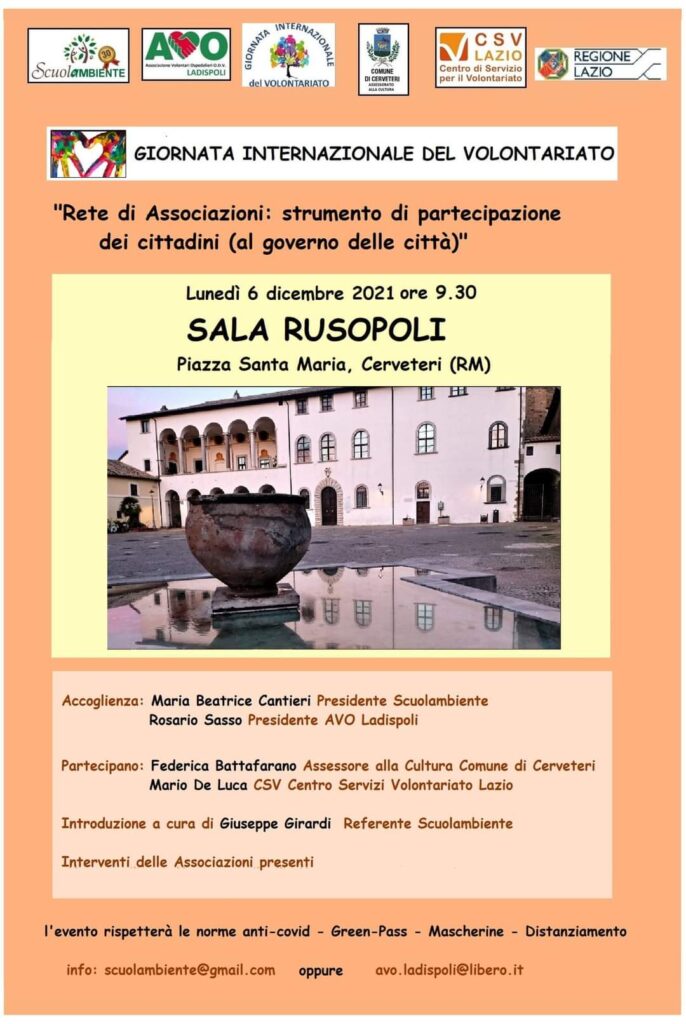 Si terrà lunedì 6 dicembre a partire dalle 9:30 una conferenza per la Giornata Internazionale del Volontariato, presso la Sala Ruspoli in Piazza Santa Maria a Cerveteri.