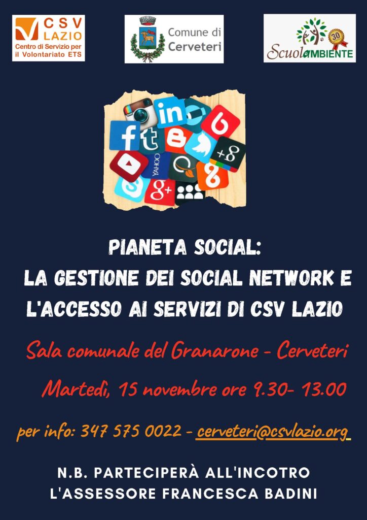 “Pianeta Social: la gestione dei Social Network e l’accesso ai servizi di CSV Lazio” è una conferenza che si terrà martedì, 15 novembre dalle ore 9.30 alle 13.00.