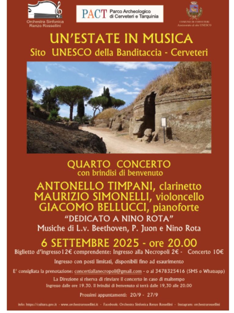 Dopo la pausa estiva, riprendono i concerti della rassegna “Un’Estate in Musica” organizzata dall’Orchestra Sinfonica Renzo Rossellini. L’appuntamento, il quarto dei sei previsti, si terrà sabato 6 settembre presso l’incantevole scenario della Necropoli della Banditaccia.