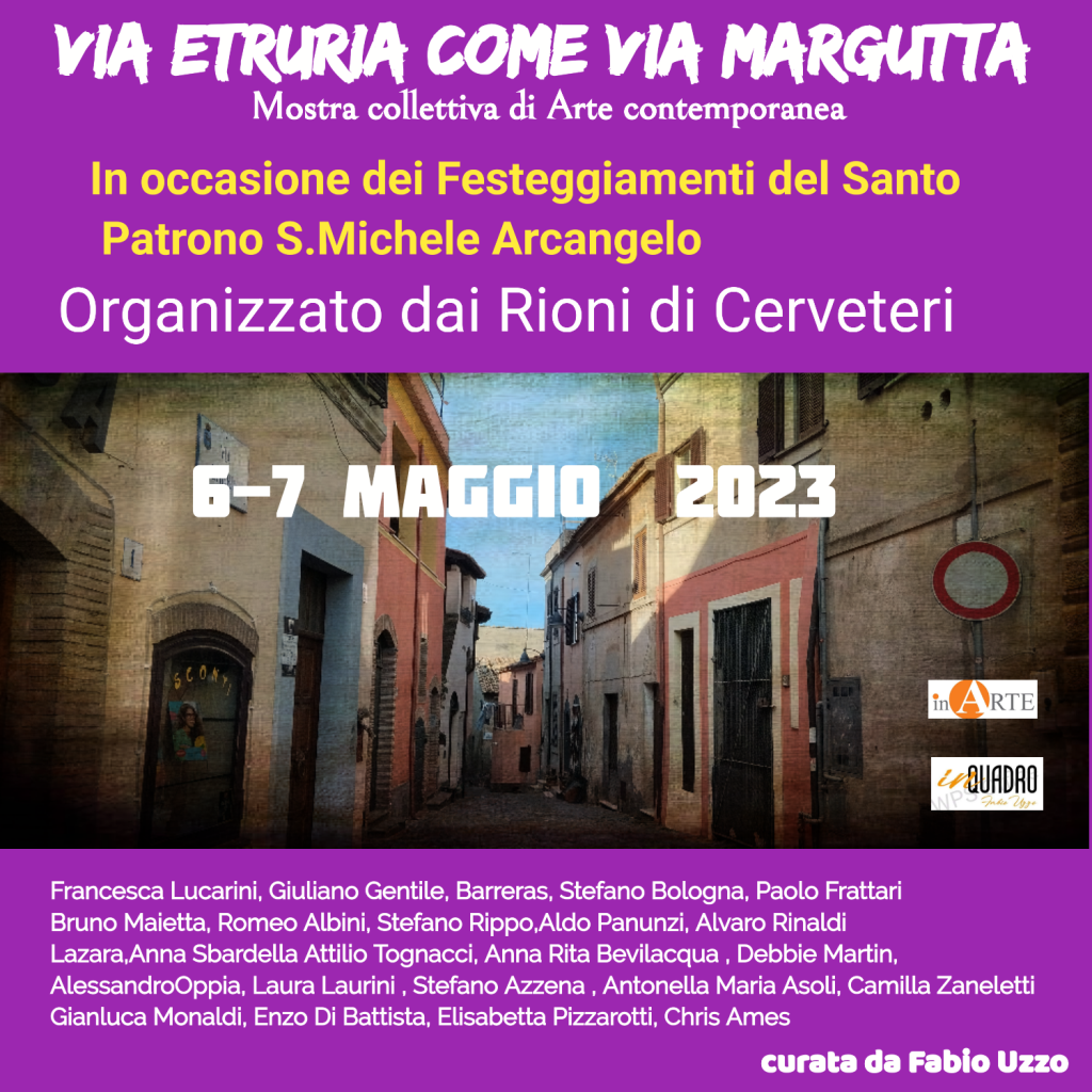 In occasione dei festeggiamenti del santo Patrono S. Michele Arcangelo, l’associazione culturale inArte invitata dai Rioni di Cerveteri, addobberà una caratteristica via del borgo caeretano, Via Etruria, con le opere dei suoi artisti che hanno accettato di contribuire con le loro creazioni di abbellire e caratterizzare una via del centro storico, su strada, uscendo per una volta dai luoghi istituzionali da dove generalmente presentano i loro lavori.