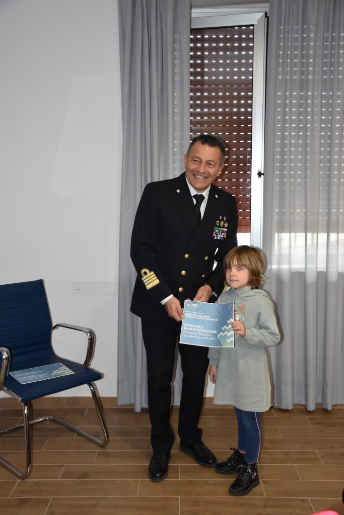 Sono particolarmente lieto che, in un’edizione speciale come quella di quest’anno, che celebra il 160° anniversario della fondazione del Corpo, abbia vinto il disegno GLI EROI DEL MAREdella giovane Morgana della sezione A della Scuola dell’Infanzia Vignacce di Santa Marinella–afferma il C.V. Michele Castaldo- Il mio plauso và a Morgana che oggi ho accolto qui in Capitaneria insieme a tutti i bambini che con la sapiente guida delle insegnanti sono stati indirizzati a sviluppare la naturale propensione verso la natura nel contesto di un’iniziativa civica molto ampia della quale anche noi continuiamo ad essere parte provando a conquistare quotidianamente l’appellativo “Gli eroi del mare”.
