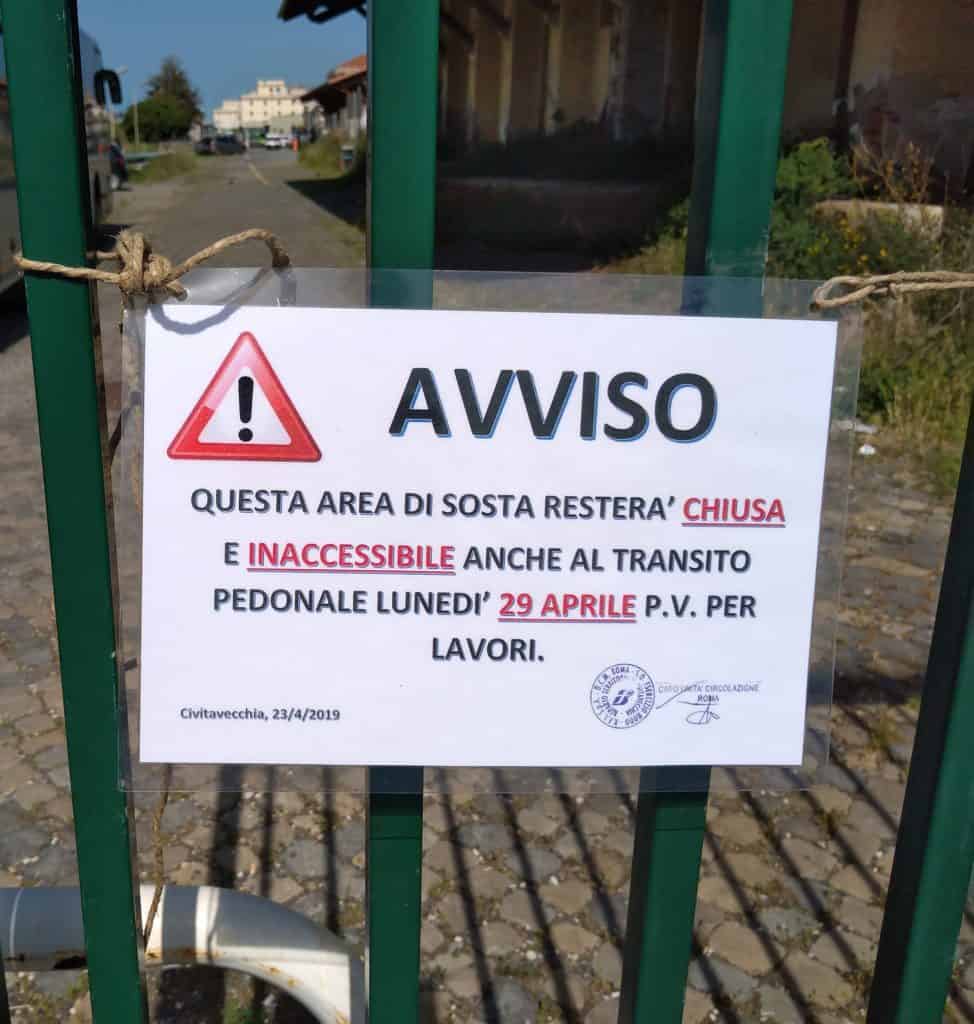 “Attenzione, informiamo gli utenti della stazione di Civitavecchia che il giorno lunedì 29 aprile 2019, a causa di non meglio precisati lavori da eseguire, sarà chiuso al traffico veicolare e pedonale il collegamento tra il nuovo parcheggio di Viale della Vittoria e la stazione ferroviaria. In allegato trovate una foto del suddetto avviso”.