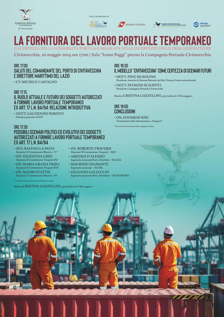 Per festeggiare il proprio 127° anno, la Compagnia Portuale Civitavecchia, anche in ottica dell’annunciata e possibile riforma dei porti e in continuità con l’evento di Genova dello scorso 25 marzo, vuole invitare tutto il cluster portuale locale e nazionale ed ogni cittadina e cittadino all’importante convegno pubblico riguardante “La fornitura del lavoro portuale temporaneo: certezza della flessibilità portuale regolata nelle incertezze delle crisi geopolitiche”.