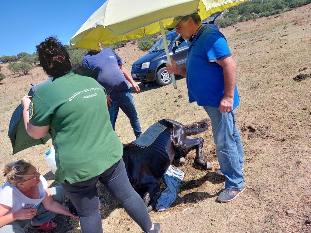 “Il tempo di prendere materiale per il soccorso, alle 14.00 eravamo sul posto dove già era presente anche la Ugolini che insieme a noi cercava di creare una zona d’ombra per il povero animale e ci aiutava con il primo soccorso! Il cavallo che è in realtà è una puledra di max due anni pian piano riprendeva conoscenza e beveva chissà da quanto tempo era senza cibo ed acqua”.